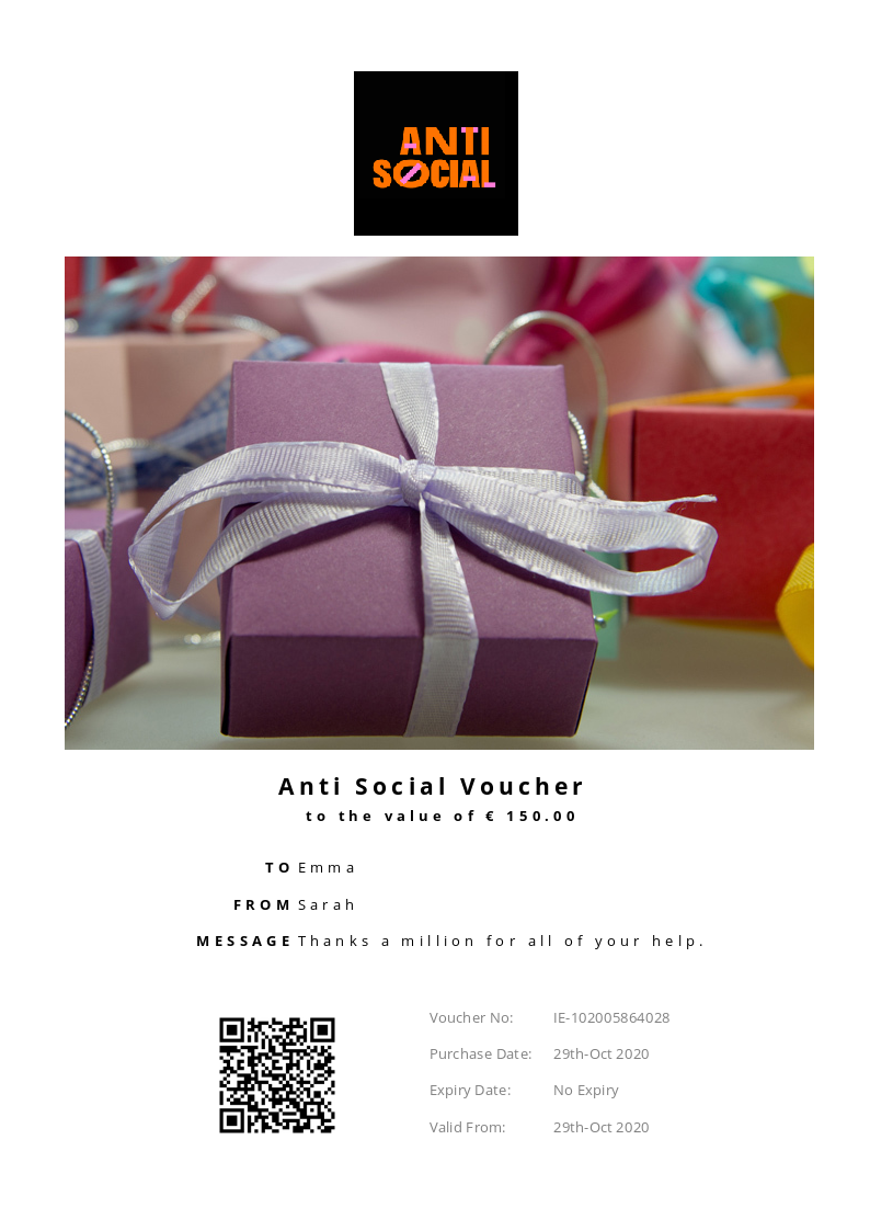 Anti Social allows you to purchase instantly printable gift vouchers, special offers and tickets using the Voucher Connect platform.